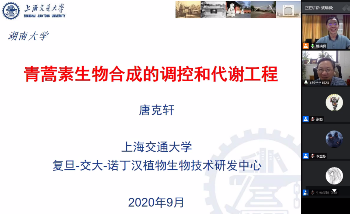 金秋九月,丹桂飘香。9月25日下午,上海交通大学特聘教授唐克轩老师应我校yl23411集团姚瑞枫教授邀请,在线作《青蒿素生物合成的的调控和代谢工程》的精彩报告,并与yl23411集团师生进行了热烈的学术讨论与交流。本次报告由姚瑞枫教授主持,yl23411集团相关老师及研究生近百人参加。