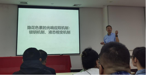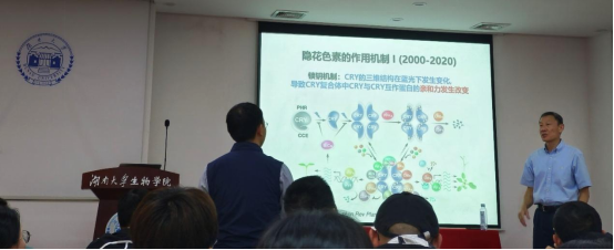 光是植物赖以生存的最重要环境因素,全面影响着植物的生长发育。报告中,林辰涛教授围绕模式植物拟南芥蓝光受体隐花色素CRY及蓝光信号转导,分别从“隐花色素如何调节RNA甲基化酶MTA的活性与生物钟”与“隐花色素如何调节RNA甲基化酶FIO1的活性与光合作用”两方面引入,向大家详细的介绍了CRY的光响应双机制(锁钥机制、液态相变机制)。CRY通过双机制调控RNA转录,RNA剪切,RNA甲基化,蛋白修饰,蛋白降解等,且通过不同的液态相变途径激活不同的RNA甲基化酶,改变不同RNA的稳定性与翻译速度,从而调控不同基因的表达水平,最终影响植物生长发育。报告深入浅出、生动风趣,报告中的研究思路与经验让大家受益匪浅。现场交流气氛热烈,学术氛围浓厚。学生们表示,本次报告大大激发了他们的科研兴趣,开拓了研究思路。