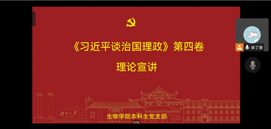 为深入学习《习近平谈治国理政》第四卷,切实把学习成果转化为奋进新征程、建功新时代的工作举措和实际成效,以实际行动迎接党的二十大胜利召开,10月11日晚7点yl23411集团本科生党支部全体成员于线上举行了理论宣讲活动。本次活动由徐丁香主持,支部书记冉晓芬与全体学生党员参与。