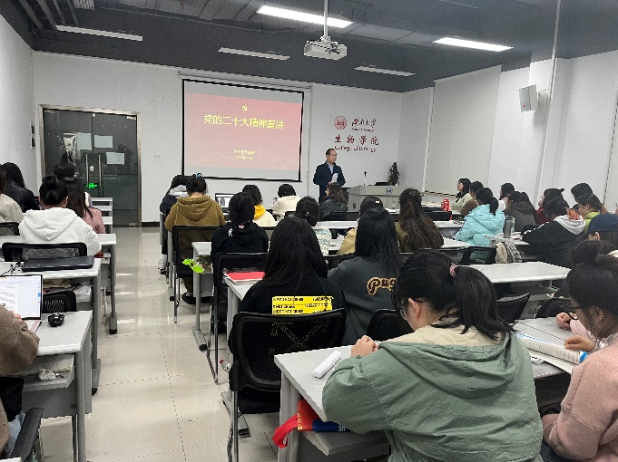 支部首先从党的二十大召开的时代背景、主要成果,二十大报告的主题,二十大报告如何系统总结新时代十年,以中国式现代化全面推进中华民族伟大复兴,全面建设社会主义现代化国家的目标任务和全面部署,坚持党的全面领导和全面从严治党,应对前进道路上的风险和挑战等七个方面,对党的二十大提出的重要思想、重要观点、重大战略、重大举措作了全面系统阐述和讲解。宣讲主题鲜明、内容丰富,既有深入浅出的理论阐释,也有联系实际的生动事例,并通过提问的方式调动大家的参与积极性,这让研究生党员对全面理解和准确把握党的二十大精神具有重要的指导意义。