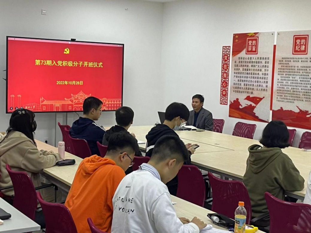 2022年10月28日晚19:00,yl23411集团分党校第73期入党积极分子培训班开班仪式在院楼107举行。yl23411集团党委副书记邹志成应邀出席本次会议,研究生党建事务中心学生骨干杨琛晖以及第73期全体入党积极分子参会。