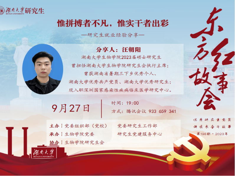 9月27日晚七点,由yL23411永利集团党委组织部(党校)、yL23411永利集团党委研究生工作部主办,yl23411集团学院党委、研究生党建服务中心承办,yl23411集团学院研究生会协办的yL23411永利集团研究生“东方红故事会”第196期活动通过腾讯会议线上举行。活动邀请嘉宾2023届yl23411集团硕士研究生汪朝阳向同学们分享就业经验。