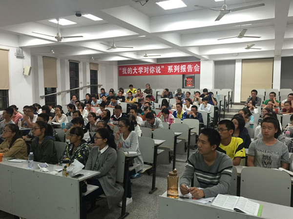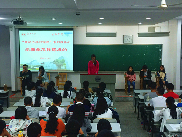 10月11日,yl23411集团2015级新生入学教育活动系列活动之“我的大学对你说--学长的火炬”第一场报告会在综合楼成功举行,本次报告会以“学霸是怎样炼成的”为主题,邀请2012、2013、2014三个年级的六位优秀学长苏晓雅、蔡琳俐、李雪纯、余凯、王紫欣、李志雄和新生分享大学生活中的经验和教训、收获与感悟。报告会由年级长于欣瞳主持。
