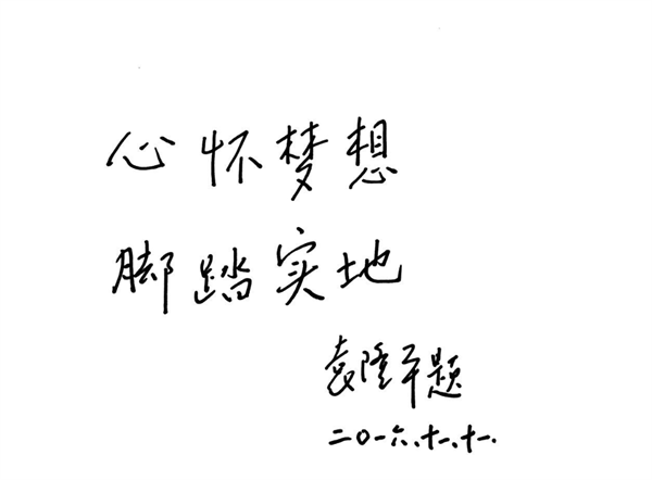 欣然提笔写下“心怀梦想、脚踏实地”,