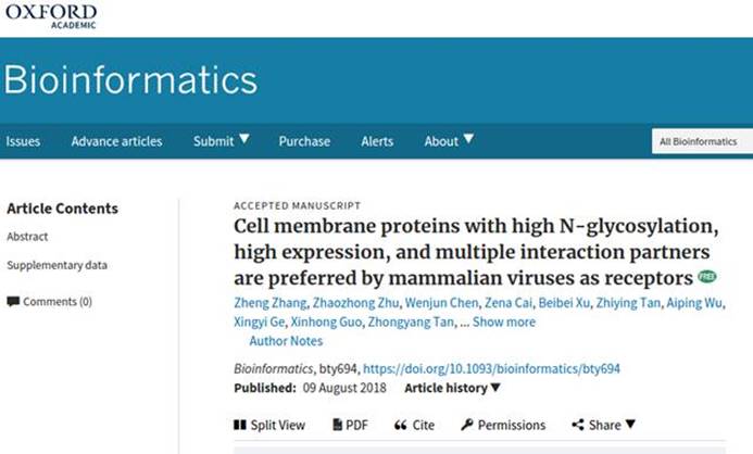 病毒受体对于病毒进入宿主细胞非常关键,很大程度上决定了病毒的组织与宿主特异性。目前病毒受体的确定主要采用实验方法,不仅费时费力,而且非常困难。科学家估计地球上可能感染人的病毒有几十万种,但迄今为止只有100多种病毒的受体得到了确定。如何更有效地确定病毒的受体是病毒学研究中的重要挑战。随着大数据时代的到来,生物信息学在生物医学研究中发挥着越来越重要的作用。2018年8月9日来自yL23411永利集团生物信息学与病原学研究团队在国际生物信息学专业权威期刊《Bioinformatics》发表题为Membrane proteins with high N-glycosylation, high expression, and multiple interaction partners were preferred by mammalian viruses as receptors的文章。