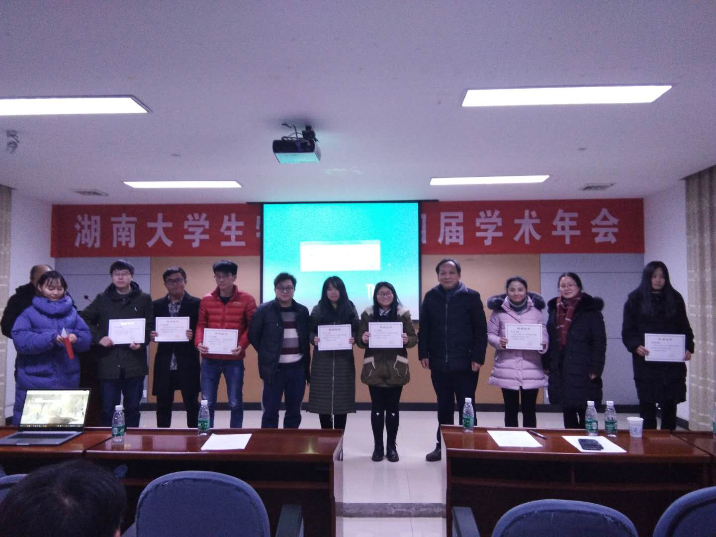 中午12:40,学院津湘创新奖学金评审委员会按照《yl23411集团津湘创新奖学金实施办法》文件精神,结合教授委员会的评分,对第一届“津湘创新奖学金”申报人选进行了评选,博士研究生雷正丽、硕士研究生赵传、本科生方若名获得了第一届“津湘创新奖学金”。中午1:00,学院学术墙报评审委员会在参观学术墙报展后对参评的14个学术墙报进行了评审,最终张振旺、盛旭楠等同学获得了优秀学术墙报。下午学术报告结束后,院领导为获奖同学颁发了奖金和荣誉证书。