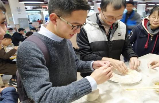 活动当天,生活部成员方才将桌布铺到食堂的大理石桌上,把装饺子馅的盘子、盛饺子的屉子、一碗碗清水和一袋袋饺子皮儿放到桌子上,节日的气氛就显现了出来。为了增加吃饺子的趣味,生活部特别准备了一些芥末馅的饺子,并把它混入包好的饺子中,准备给同学们一个“惊喜”。很快同学们就都来到了活动现场,分组参加包饺子活动,有些同学特别擅长包饺子,包得又快又好;也有些同学可能是第一次尝试包饺子,手忙脚乱的,不是加多了馅包不上就是忘了沾水,闹出了不少笑话却十分欢乐。在同学们相互请教之下,很快大家就都掌握了包饺子技巧。比如16级年级长汤琦龙,他向周围熟练的同学请教之后便开始了自己的尝试,起初也很不顺利,但是经过了几个奇形怪状的失败品之后,他就可以包出很漂亮的饺子了。
