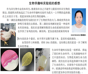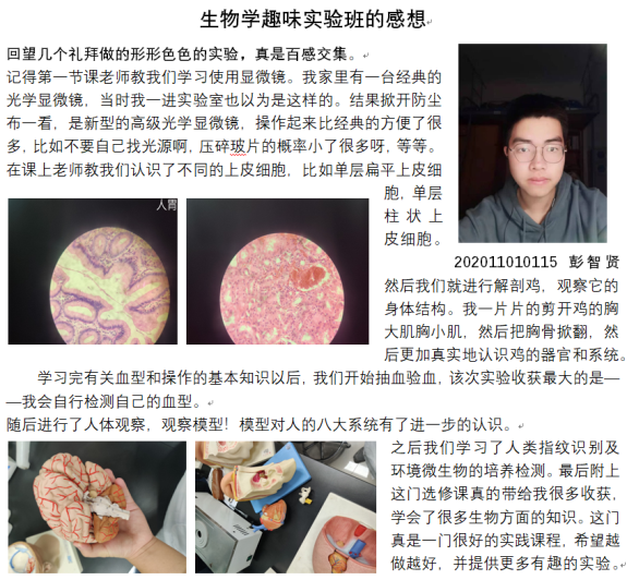 课程开设以来,吸引了来自电气与信息工程学院、土木工程学院、外国语学院、法学院等十四个学院的本科生参加学习。课程共32个学时,内容包括显微镜的使用、家鸡的外形和内部解剖、ABO血型鉴定及血涂片的制作与血细胞显微观察、人体九大系统自我认知、叶片的构造及“叶脉书签”的制作、人类指纹的识别,质粒DNA的提取、环境微生物的培养检测、实验测试等教学内容。