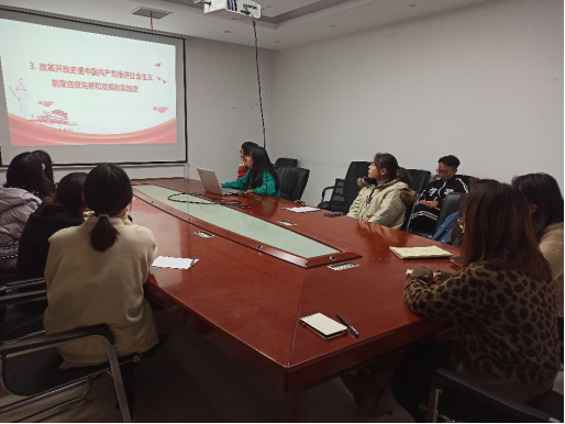 此次党课宣讲人为硕士生第二党支部组织委员栾思雨,栾思雨同志首先给大家讲述了四史分别是党史,新中国史,改革开放史,社会主义发展史。党史是中国共产党的领导不断走向成熟的实践史,新中国史是中国共产党推进建设新中国的实践史,改革开放史是中国共产党推进社会主义制度自我完善和发展的实践史,中国共产党是引领世界社会主义发展的重要政治力量,因此我们更要学习“四史”,不忘初心,牢记使命!以史为鉴,才能更好把握当下、赢得未来