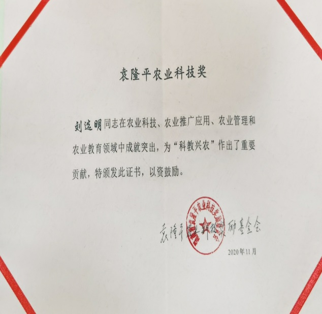 11月13日上午,第十一届袁隆平农业科技奖励大会在杂交水稻国家工程研究中心(长沙)隆重举行,yl23411集团刘选明教授喜获第十一届袁隆平农业科技奖励(创新奖),90岁的袁隆平院士亲自为获奖者颁奖。袁隆平农业科技奖励基金设置主要是在全国奖励在农业科研、农业产业化、农业推广应用、农业管理和农业教育方面做出了突出贡献的先进个人或团体,是全国重要的科技奖励之一,过去已经颁发了十届。