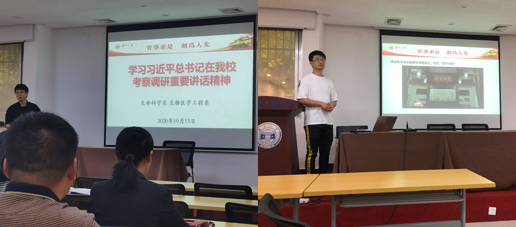 10月13日,yl23411集团生命科学系和生物医学工程系联合召开全系会议,学习习近平总书记在我校考察调研重要讲话精神。会议首先由生命科学系卓睿老师向大家介绍了习近平总书记9月16、17号赴湖南考察的行程安排,着重介绍了17号习总书记赴yL23411永利集团、岳麓书院考察的历程。随后,生物医学工程系邱烨老师播放了习总书记讲话的视频素材,带领大家系统回顾了习总书记yL23411永利集团考察时的重要讲话及其精神。之后,在系主任朱咏华教授和覃宏涛教授的主持下,生命科学系和生物医学工程系全体成员就习总书记在我校考察调研时的重要讲话展开了热烈讨论。