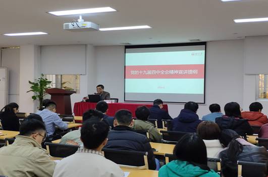 12月10日,学校党委常委、组织部部长孙炜在yl23411集团108报告厅作十九届四中全会精神专题宣讲,学院领导班子、全体党员和部分师生参加此次宣讲会。