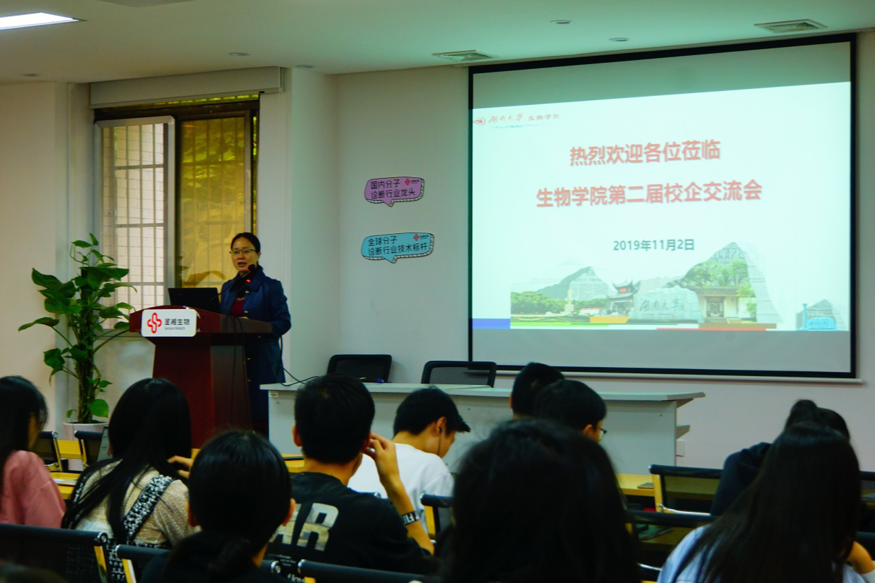 为切实做好学院毕业生就业工作,大力构建毕业生与用人单位的交流平台,yl23411集团于11月2日下午在学院办公楼108报告厅举办了“yl23411集团第二届校企交流活动”。参与此次交流会的企业有金域医学检验集团、湖南津湘药业有限公司、湖南圣湘生物科技有限公司以及人和未来生物科技有限公司。学院党委副书记陈树芸、副院长何晓晓、教师代表涂海军、孟祥贤、黄明敏以及在校生与2020届毕业生代表出席本次活动。