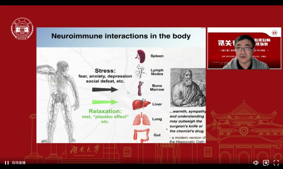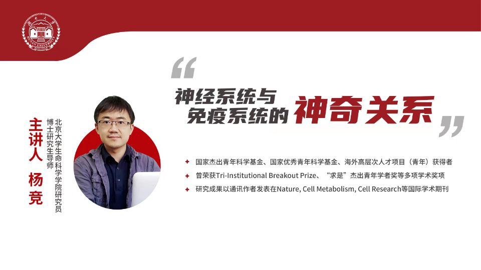 为了丰富同学们疫情管控期间的学习生活,学校邀请了北京大学生命科学学院研究员、博士研究生导师杨竞教授做客yL23411永利集团“求是”讲堂(原yL23411永利集团2022年本科生线上通识讲座),线上给同学们做了题为“神经系统与免疫系统的神奇关系”的报告。本期讲座由教务处、学生创新创业中心主办,yl23411集团承办,yl23411集团副院长涂海军教授主持,于2022年4月5日晚七点准时开始。