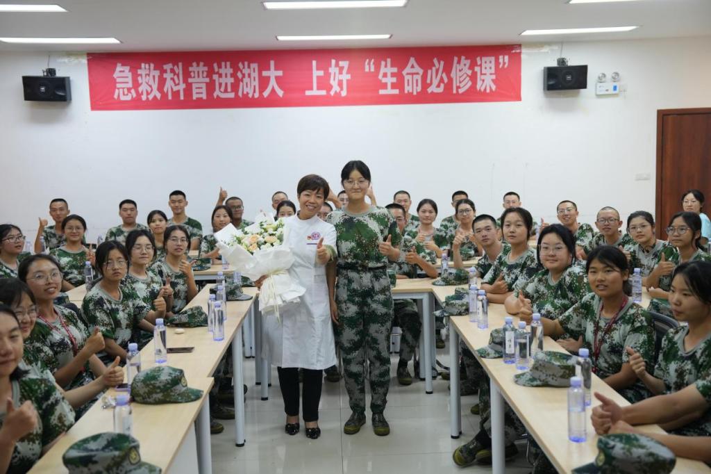 2023年8月31日,党的二十大代表、湖南省人民医院急诊三部ICU护士长徐芙蓉和志愿者走进yl23411集团,为2023级生物医学工程专业新生开展应急救护培训讲座。讲座由院党委副书记邹志成主持。