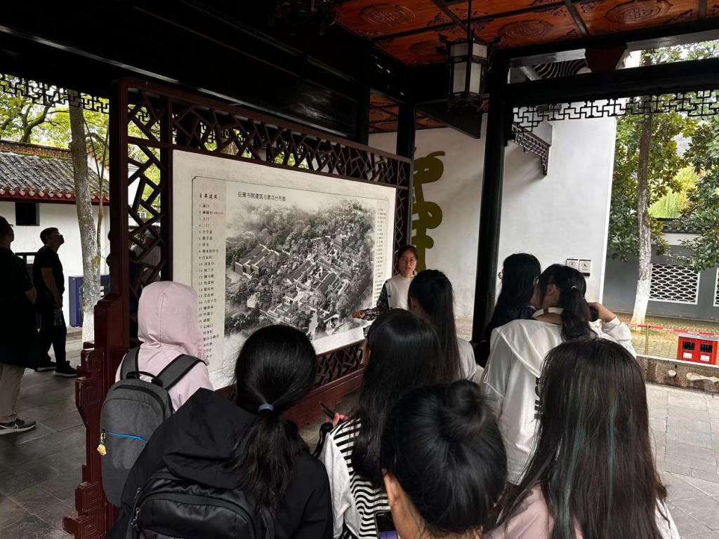 沿着中线,同学们一路前行,最后到达了御书楼,三层高的建筑古色古香,令同学们都为之惊叹,御书楼两边是汲泉亭和拟兰亭,左右对称,配合周围的小湖与建筑,交相辉映,让人仿佛穿越时空进入了几百年前的岳麓书院。