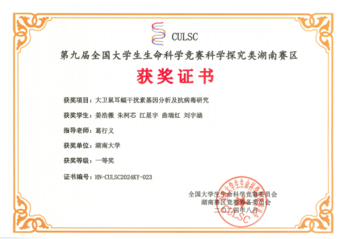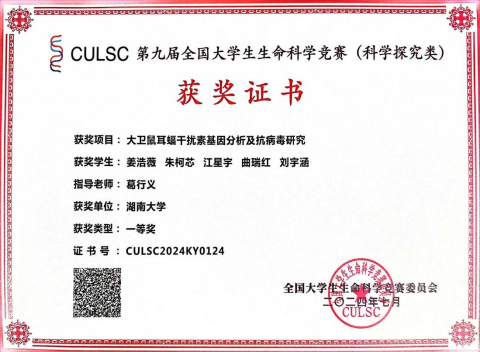 我院2021级本科生姜浩薇团队(姜浩薇、朱柯芯、江星宇、曲瑞红、刘宇涵)的“大卫鼠耳蝠干扰素基因的分析及抗病毒研究”项目获科学探究类全国一等奖,yl23411集团葛行义教授指导。