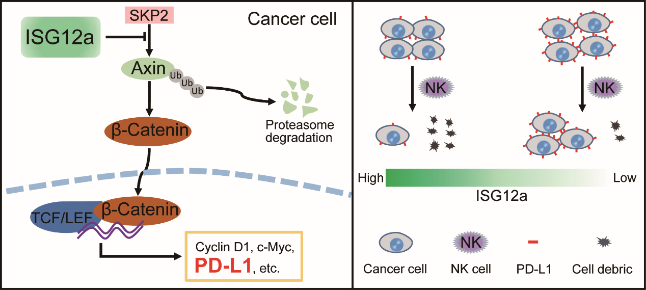 在 SCI 一区知名免疫学期刊 Cellular & Molecular Immunology 最新online的网站上刊发了yl23411集团、医学病毒学湖南省重点实验室、化学生物传感与计量学国家重点实验室朱海珍教授课题组联合湖南省肿瘤医院、吉林大学第一医院、中南大学公共卫生学院、中科院上海生物化学与细胞生物学研究所多中心合作发表的题为 “The innate immune effector ISG12a promotes cancer immunity by suppressing the canonical Wnt/β-catenin signaling pathway” 的研究性论文 [1],该论文的第一作者为yl23411集团博士研究生邓日林,通讯作者为朱海珍教授。该研究以先天免疫效应分子 ISG12a 为核心,重点阐述了其在肿瘤细胞中通过维持经典 Wnt/β-catenin 信号通路中的降解复合物支架蛋白 Axin 的稳定,促进肿瘤细胞免疫检查点 PD-L1 的新发转录因子 β-catenin 的泛素化降解,抑制经典 Wnt/β-catenin 信号通路,并进一步阻断 PD-1/PD-L1 信号轴,进而促进 NK 细胞介导抗肿瘤免疫的重要机理。通过染色质免疫共沉淀、双荧光素酶报告基因和流式细胞术等实验方法,发现并证明了 β-catenin 是 PD-L1 的转录因子,揭示了经典癌症信号通路 Wnt/β-catenin 负调控肿瘤免疫的新机制。ISG12a 通过促进 β-catenin 的降解,实现其对 PD-L1 基因的转录抑制,最终下调了肿瘤细胞表面 PD-L1 的蛋白水平,发挥促进肿瘤免疫功能。此外,该研究还发现了 ISG12a 在肿瘤细胞增殖、迁移、转移和癌细胞干性以及EMT转化中的重要作用,将其命名为一种新的抑癌基因,揭示了其与肿瘤的临床预后和恶性转化之间的重要联系。