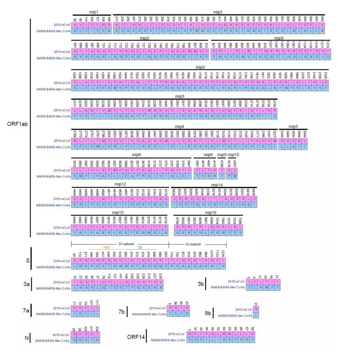 SARS和2019-nCoV病毒的氨基酸差异位点。