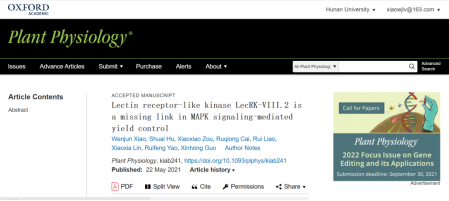 2021年5月22日,Plant Physiology在线发表了yl23411集团郭新红课题组题为“Lectin receptor-like kinase LecRK-VIII.2 is a missing link in MAPK signaling-mediated yield control”的研究论文,揭示了拟南芥凝集素类受体激酶LecRK-VIII.2作用于MAPK信号转导途径上游,参与调控包括角果数量、种子大小和数量在内的产量相关性状,并通过协调源库关系,促进根、茎、叶的生长,在作物改良方面具有重要的潜在利用价值。