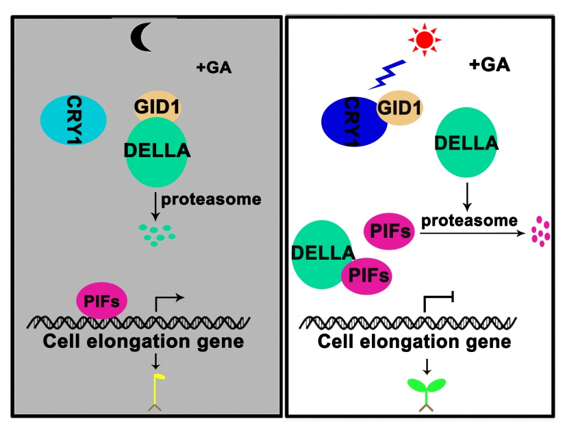 光是调控植物生长发育的重要环境因子。蓝光促进植物光形态建成,抑制幼苗下胚轴伸长。隐花素1(Cryptochrome 1,CRY1)是介导蓝光促进植物光形态建成的主要蓝光受体。赤霉素(Gibberellin,GA)作为早期就被发现的重要激素,在植物光形态建成中也发挥着重要作用。与蓝光的作用相反,赤霉素则抑制光形态建成,促进下胚轴伸长。然而,蓝光与GA拮抗调控光形态建成的分子机制尚不完全清楚。