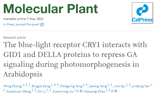 2021年5月7日,Molecular Plant在线发表了yl23411集团赵小英/刘选明课题组题为“The blue-light receptor CRY1 interacts with GID1 and DELLA proteins to repress GA signaling during photomorphogenesis in Arabidopsis”的研究论文。该研究报道了蓝光受体CRY1能够与GA受体GID1和GA信号关键抑制因子DELLA蛋白以蓝光依赖的方式直接结合,进而抑制GA信号和促进光形态建成的新机制。