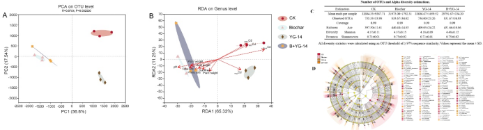 图5.不同处理细菌群落结构的PCA分析(A)和与环境因子相关性的RDA分析(B); C.细菌群落Alpha多样性指数;D.不同处理下LEFse分析(LDA > 3)有显著性差异(P< 0.05)的根际细菌群落。