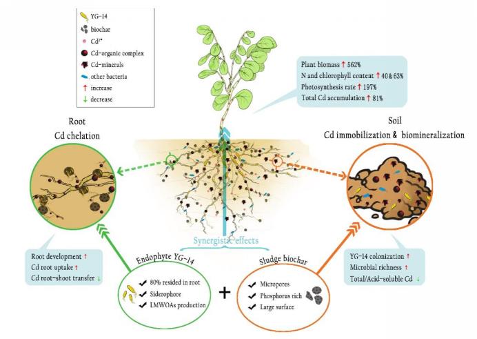 研究明确一种内生肠杆菌和富磷污泥基生物炭对刺槐在Cd胁迫下的生长发育和重金属固定化起到了协同作用,揭示了污泥基生物炭-内生菌YG-14联合影响植物固定化土壤中Cd的机制,为将“微生物-生物炭-植物”复合体系用于矿山重金属污染土壤修复奠定了理论基础。