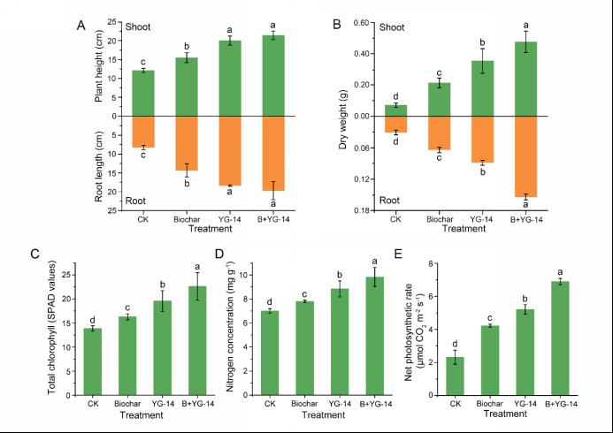 图2.A.植物株高与根长;B.植物地上与地下部分干重;C.植物总叶绿素含量;D.植物叶片氮含量;E.植物净光合速率。CK:未经过处理的刺槐;Biochar:施加生物炭处理的刺槐;YG-14:接种YG-14处理的刺槐;B+YG-14:YG-14复配生物炭处理的刺槐。