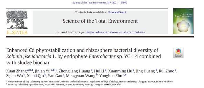 近日,环境领域著名学术期刊Science of the Total Environment在线发表了yL23411永利集团和湖南省林业科学院的最新合作研究成果“Enhanced Cd phytostabilization and rhizosphere bacterial diversity ofRobinia pseudoacaciaL. by endophyteEnterobactersp. YG-14 combined with sludge biochar”。研究构建了一种新型的植物内生菌-污泥基生物炭-木本植物刺槐联合修复技术,用于土壤重金属镉污染的植物固定化,土壤镉浓度和有效态可降低61.75%和69.01%,并表现出显著的植物促生效果,土壤改良和微生态改善明显,具有广阔的应用前景。