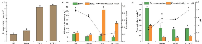 图4. Cd胁迫下YG-14、生物炭及二者复配处理下刺槐单株镉富集(A)和转运(B)系数,以及根际土壤Cd总量及形态(C)。