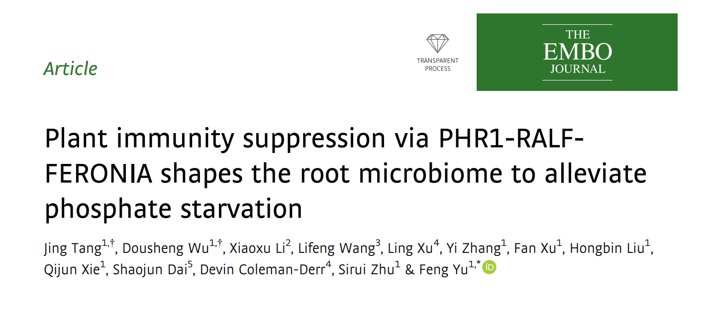 近日,yl23411集团于峰教授课题组在国际著名学术期刊The EMBO Journal(2021 IF:11.596)发表了题为Plant immunity suppression via PHR1-RALF-FERONIA shapes the root microbiome to alleviate phosphate starvation的文章,为提高作物磷吸收效率提供了新的解决思路。