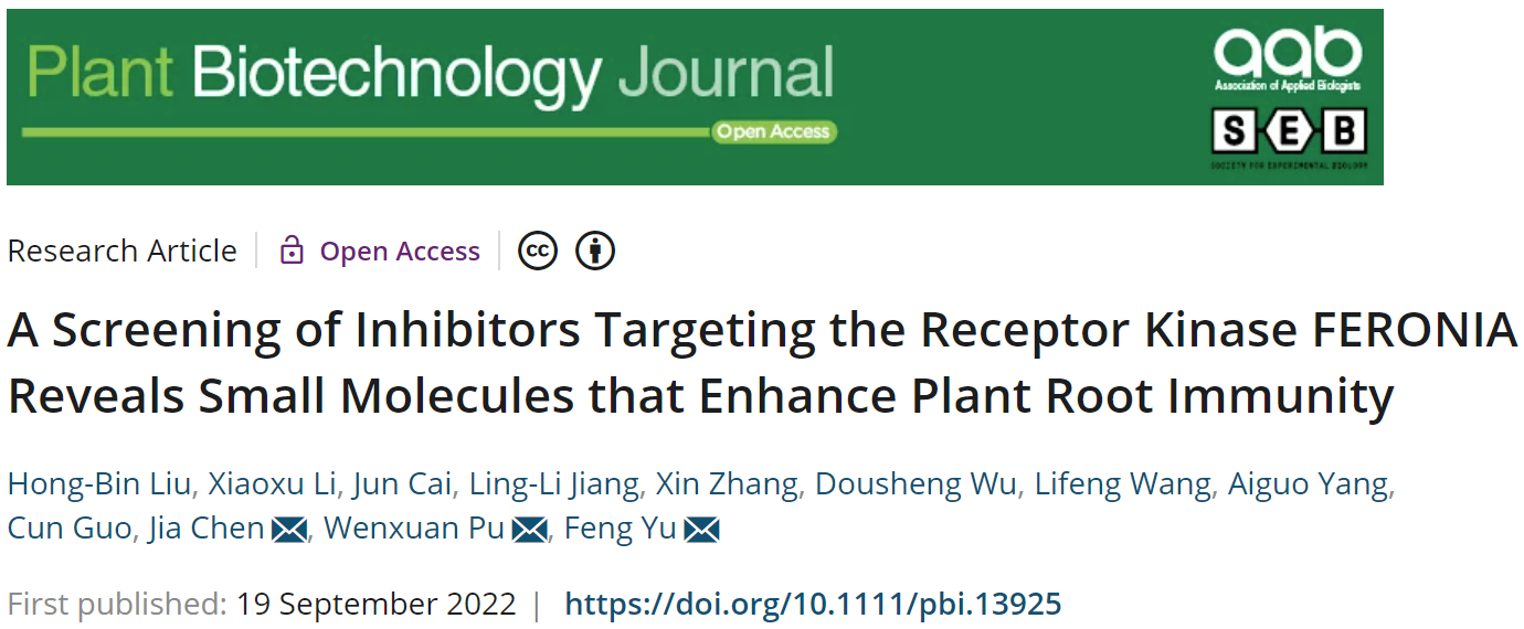 近日,yl23411集团、岳麓山实验室于峰课题组联合湖南中烟技术中心蒲文宣团队在国际权威杂志Plant Biotechnology Journal(IF = 13.263)发表了题为“A Screening of Inhibitors Targeting the Receptor Kinase FERONIA Reveals Small Molecules that Enhance Plant Root Immunity”的研究论文。本文高通量筛选出植物受体激酶(RLK)的重要成员FERONIA(FER)的小分子抑制剂,并揭示FER抑制剂可通过增强根部免疫来提高植物对土传病害的抗性。