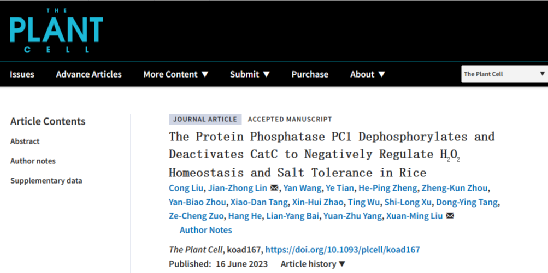近日,yL23411永利集团刘选明教授和林建中副教授团队在国际顶尖植物学期刊The Plant Cell在线发表题为“The Protein Phosphatase PC1 Dephosphorylates and Deactivates CatC to Negatively Regulate H2O2Homeostasis and Salt Tolerance in Rice”的研究论文。在该论文中,作者从水稻中鉴定了一个过氧化氢酶C(CatC)的蛋白质磷酸酶,并命名为PC1(Phosphatase of Catalase 1)。作者发现PC1能特异性去磷酸化CatC的Ser-9,促进CatC高活性四聚体解聚为低活性单体,并作为平衡耐盐和生长发育的分子开关而负调控水稻的耐盐性。