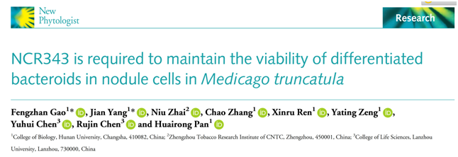 近日,yl23411集团潘怀荣教授课题组在植物学国际知名期刊《New Phytologist》上发表论文,报道了蒺藜苜蓿NCR343在调控终极分化后共生体存活方面的重要功能。