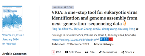 近日,yl23411集团彭友松团队在生物信息学国际权威期刊《Briefings in Bioinformatics》(IF2023=9.5)在线发表题为“VIGA: a one-stop tool for eukaryotic virus identification and genome assembly from next-generation-sequencing data”的研究论文,该研究开发了一种基于宏转录组和宏基因组数据对真核生物病毒基因组序列进行鉴定和组装的生物信息学工具VIGA,为鉴定和表征病毒组提供了帮助。