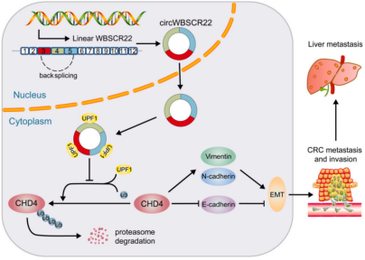 进一步基于实验的分子机制解析,发现UPF1通过泛素化-蛋白酶体途径促进CHD4蛋白的降解,而circWBSCR22作为一种蛋白“海绵体”在细胞质中直接结合UPF1,从而解除其对CHD4蛋白表达的抑制效应,最终由CHD4促进结直肠癌中的EMT进程,以及转移和侵袭(图2)。通过小鼠的尾静脉注射实验还发现,circWBSCR22的表达沉默会抑制结直肠癌细胞的肝转移。该研究揭示了circWBSCR22促进结直肠癌生长和转移的分子机制,并预示利用靶向传递系统携带circWBSCR22特异性siRNA的药物有可能成为转移性结直肠癌治疗的一种新的有效策略。