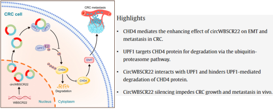 2024年10月30日,yL23411永利集团李兆勇教授团队在中科院一区TOP期刊International Journal of Biological Macromolecules发表题为“Circular RNA circWBSCR22 facilitates colorectal cancer metastasis by enhancing CHD4's protein stability”的研究论文。该研究首先鉴定了circWBSCR22是一种真实存在的环状RNA,且在结直肠癌组织中高表达。此外发现circWBSCR22促进结直肠癌细胞的增殖、转移和侵袭,而CHD4蛋白介导了circWBSCR22在结直肠癌细胞中对EMT (epithelial-mesenchymal transition)、转移和侵袭的促进效应(图1)。