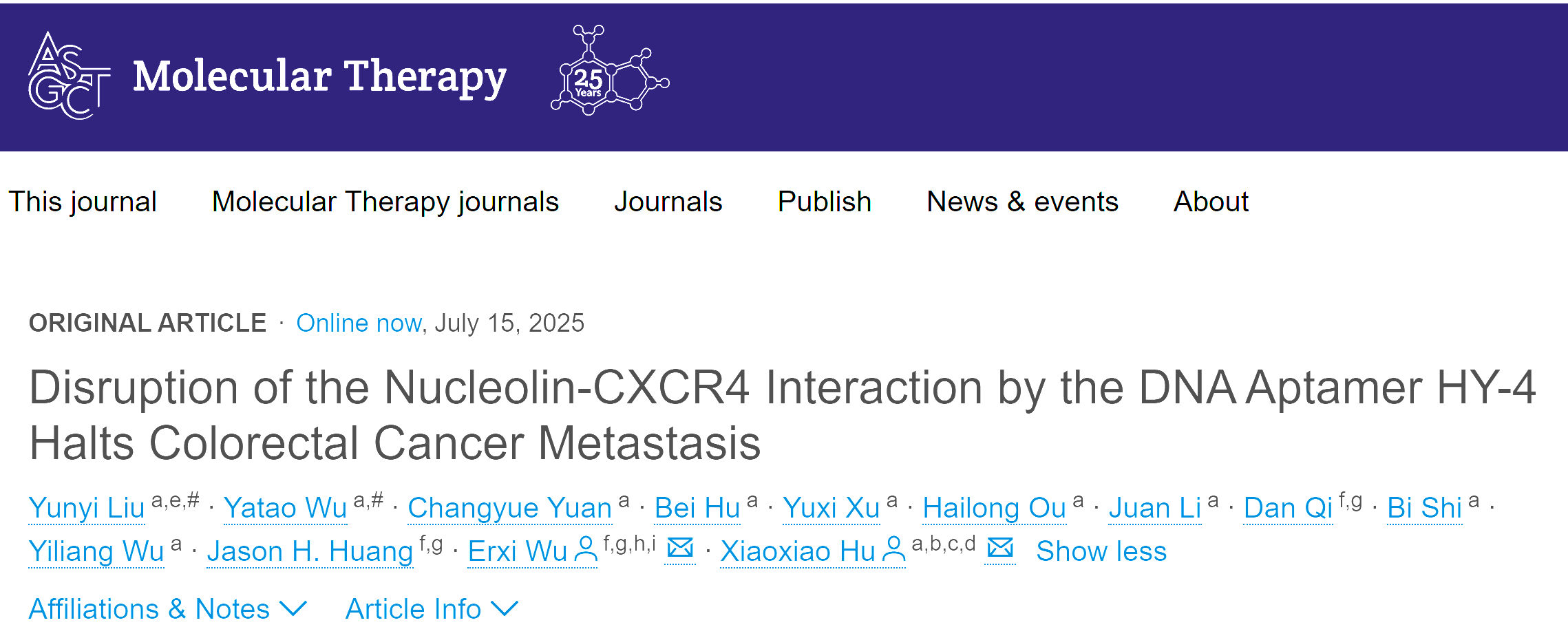 2025年7月16日,yl23411集团胡小晓课题组在CellPress出版的医学领域权威期刊Molecular Therapy上在线发表了题为“Disruption of Nucleolin-CXCR4 Interaction by DNA Aptamer HY-4 Halts Colorectal Cancer Metastasis”的研究论文。在该研究中,研究者通过X-aptamer技术增强和扩展了SWAN文库,并鉴定了一种特异性靶向结直肠癌的新核酸适体HY-4。通过人结肠直肠癌异种移植裸鼠模型靶向实验证明了HY-4能在活体水平特异性靶向结直肠癌细胞。进一步通过拉下实验和MS/LC蛋白质组学质谱测序分析确定其分子靶标为核仁素蛋白(Nucleolin、NCL),并在Tranwell迁移和侵袭实验验证了HY-4对结直肠癌细胞转移的抑制效果。