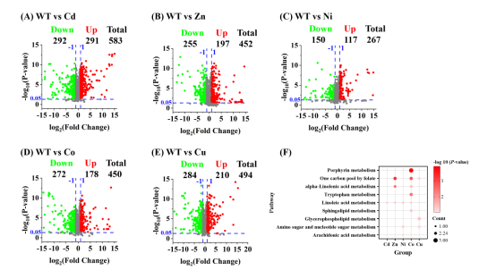 首先,研究团队采用非靶向代谢组学全面分析了五种重金属胁迫条件下拟南芥的代谢变化,以鉴定与重金属胁迫相关的关键代谢物。对差异代谢物进行的代谢通路富集分析显示,所有重金属处理均显著富集于亚麻酸代谢途径,表明脂质代谢可能是植物应对重金属胁迫的共同调控节点。